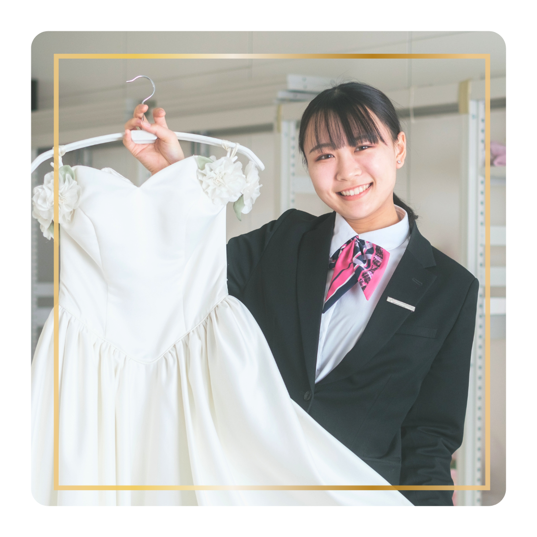 4月からは第一志望だった株式会社エヴァーズで、ドレスコーディネーターとして結婚式に携わります。内定を頂けたのは、学校で身につけた知識や思いやりなどをインターンシップで発揮することができ、自信を持って就職試験に臨めたからだと思っています。自分が身につけた知識や気配りを忘れず、「あなたで良かった」と言ってもらえるようなドレスコーディネーターを目指していきます!