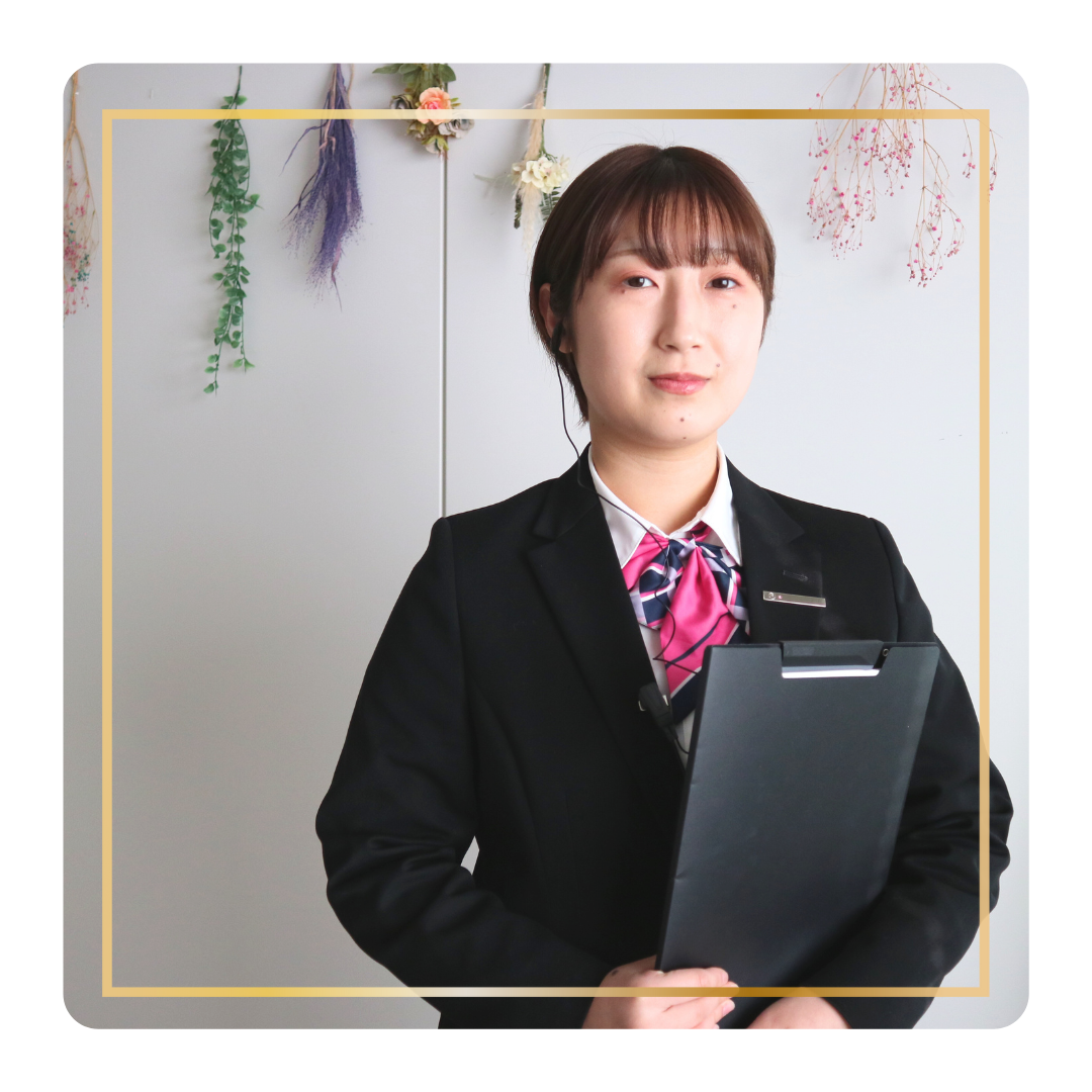 明日香国際での2年間、幅広い知識を学ぶことができ、自信の目標である「色々な視点からサポートできるプランナー」に近づくことができたと感じています。その中でも特に印象に残っているのはリアルウエディングです。新郎新婦様とのお打ち合わせや当日の運営など、本物の結婚式だからこそ学べたことも多く、とても貴重な体験となりました。